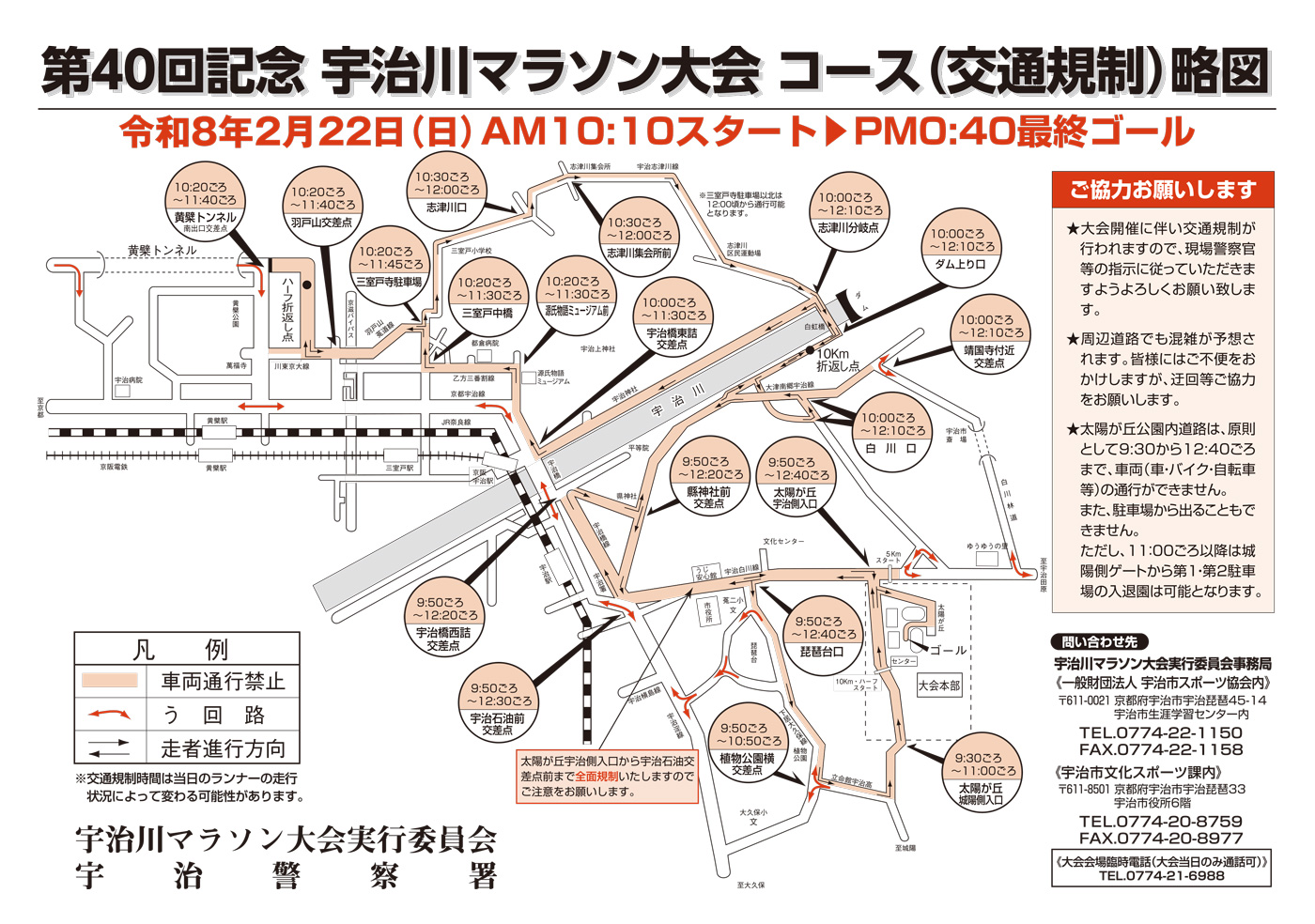 令和8年2月22日(日) 宇治川マラソン大会開催に伴い、宇治市内およびマラソンコース付近の交通規制をいたします。 車やバイクでは通行できませんので規制図で区間・時間等をご確認いただき、予めご承知の上ご来場ください。